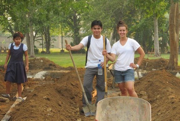 Shelbi poses with one of the students with the piles of dirt they are moving. It's hard work!!!